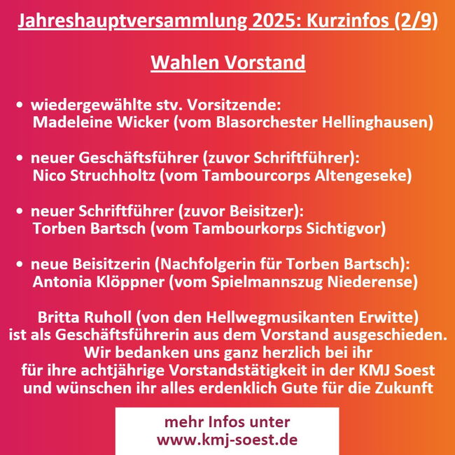 Auf der Jahreshauptversammlung der Kreismusikjugend Soest wurde Madeleine Wicker vom Blasorchester Hellinghausen zur stellvertretenden Vorsitzenden wiedergewählt. Britta Ruholl stand nach langjähriger Vorstandstätigkeit als Geschäftsführerin nicht mehr zur Wahl. Für diesen Posten wurde Nico Struchholtz aus den Vorstandsreihen vorgeschlagen und von der Versammlung gewählt. Ebenso einstimmig verlief die Wahl von Torben Bartsch zum Schriftführer. Neu im Vorstand konnte man Antonia Klöppner als frisch gewählte Beisitzerin begrüßen.